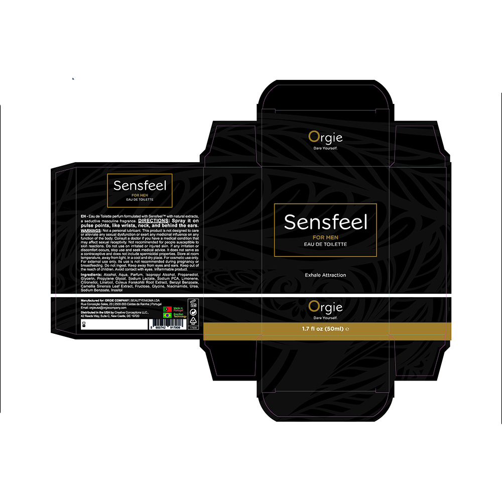 50ml regular size EDT perfume Sensfeel for Men, Orgie exclusive formula containing the natural-based active ingredient Sensfeel™ for Him, a pheromone booster that can increase the power of attraction of men through the simultaneous action of two of its components: Forskolin that increases the expression of the enzyme 3 beta-HSD enhances the production of androstadienone, and Theaflavins that reduces the activity of the 5-alpha reductase enzyme, thereby decreasing the metabolism of androstadienone and leading to its accumulation.